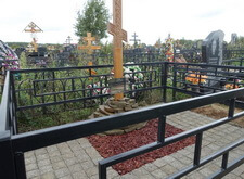 Сначала мы покрасили ограду, установили крест, положили брусчатку. Когда мы закончили укладку брусчатки пошел дождь, пришлось срочно накрыть ее пленкой. Это спасло ситуацию, если бы дождь залил брусчатку после укладки – это испортило бы работу, цемент забрызгал бы шероховатый камень, а избавиться от его следов практически невозможно.