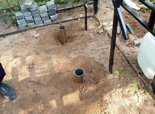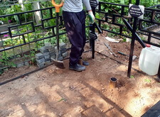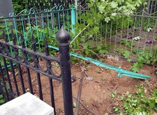 Следующим этапом стала установка ограждения. Уже готовую оградку мы привезли на участок, там собрали и выставили по периметру могилы не укрепляя. Параллельно с монтажом ограждения мы вкопали трубы на месте будущих цветников.