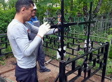 Приехав вновь на кладбище, мы взялись за очистку места захоронения от посторонних элементов: срезали болгаркой старое ограждение; пропололи сорную траву, а также разровняли землю, готовя её к покрытию бетонной плиткой.